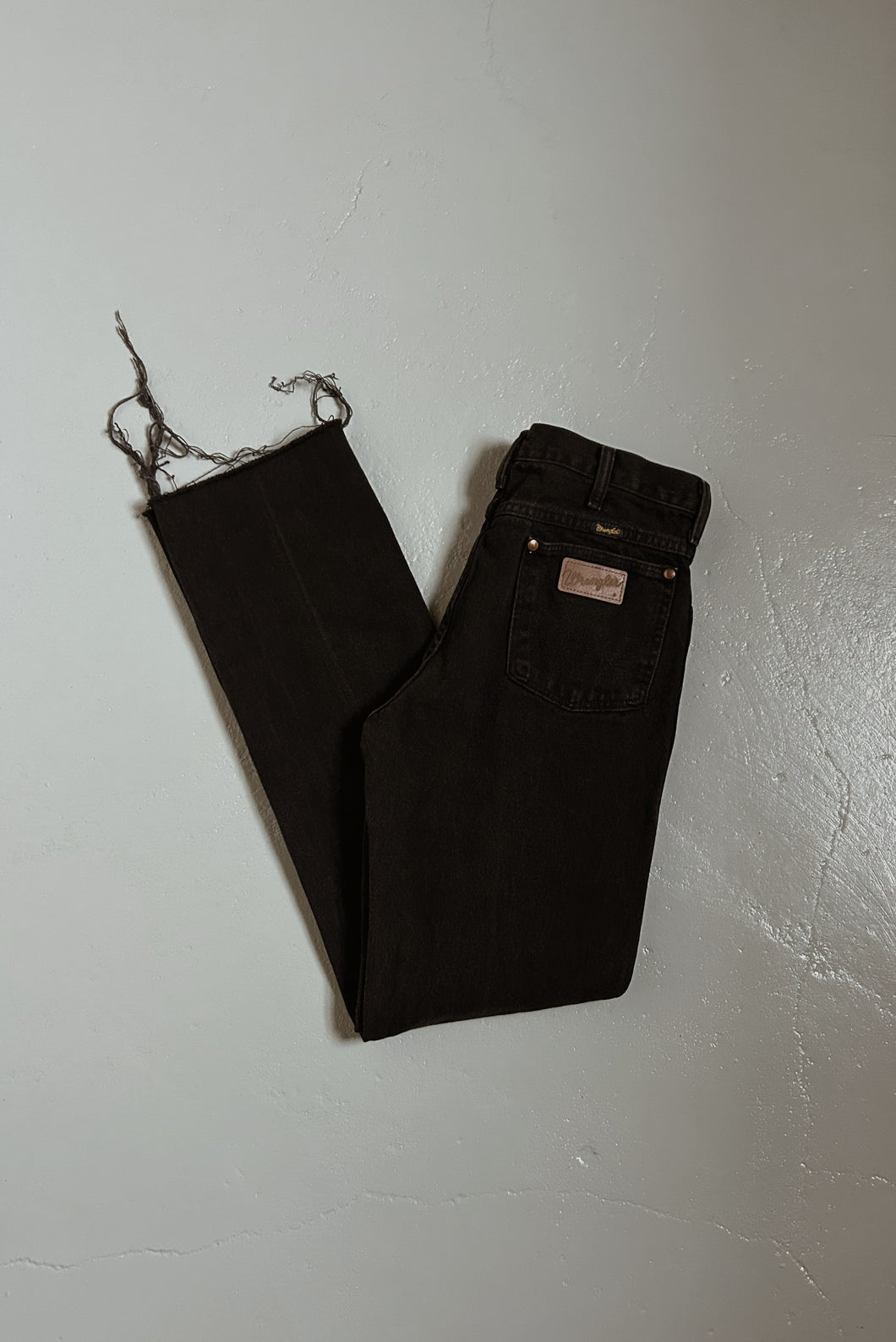 1980's Wrangler Washed Black Raw Hem Cowboy Denim | Higher Mid Rise | Classic Cowboy Raw Hem Silhouette